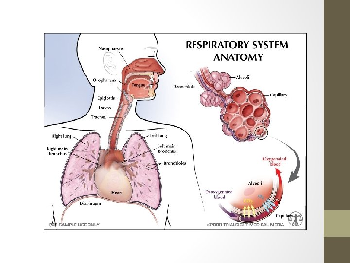 Respiratory System • Function of system: • Brings about the exchange of O 2 and CO 2 between the blood, the air and the tissues of an organism • Relationship to cellular respiration: • Provides O 2 to the cells so that glucose can be broken down/converted to ATP