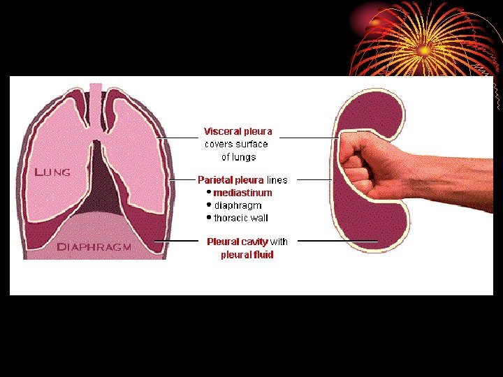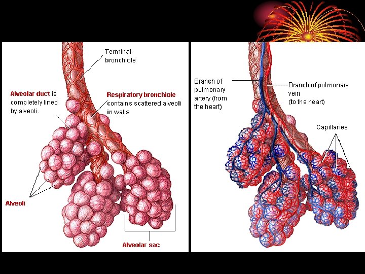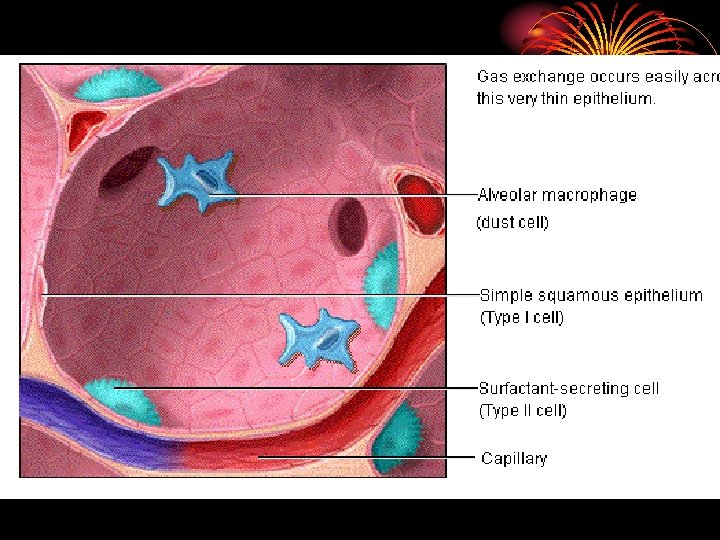 • area from 2. 5 cm 2 (trachea) to 11800 cm 2 in alveoli ? Air velocity. • 300 million alveoli, 70 m 2. • Alveoli lined by type 1 cells ( flat lining ) and type 11 cells ( granular pneumocytes secrete surfuctant ). • Pleura. • Respiratory muscles.