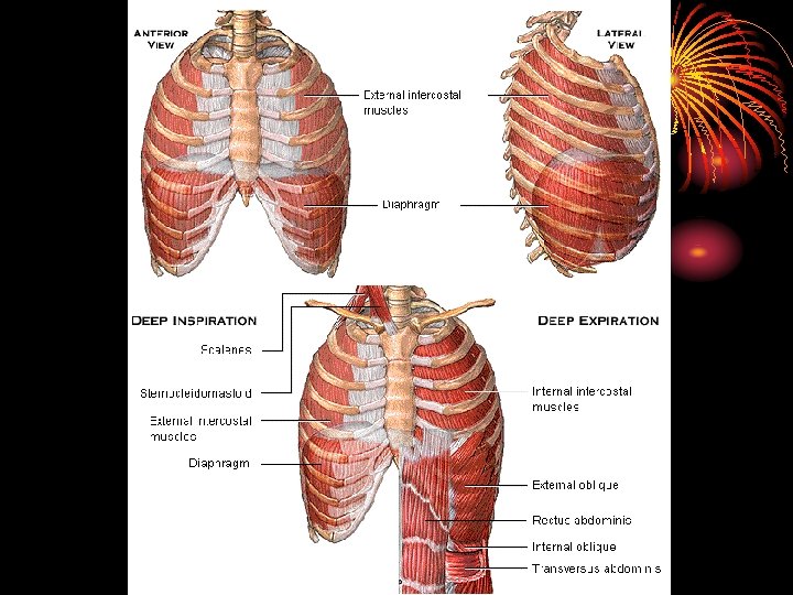Mechanics of respiration • Respiratory rate in adults 12 -15/min. • 500 ml in each breath, 6 -8 l/min. • 250 ml of O 2 taken, 200 ml CO 2 expired/min. Inspiration: Inspiratory muscles: 1. Diaphragm: vertical axis, increase thoracic cavity by 75% in quiet respiration.
