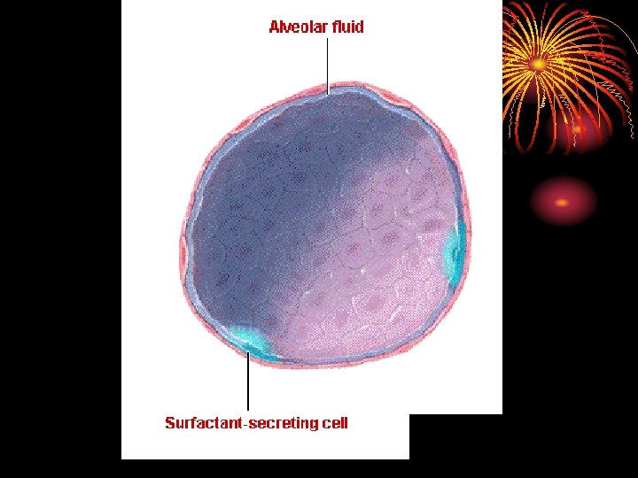 Surfactant • Lipid surface tension lowering agent. • Produced by type II alveolar epithelial cell. • Composed of phospholipids, neutral lipids, proteins and CHO. • Functions: 1. Lower surface tension in alveoli. 2. Helps to prevent pulmonary edema.