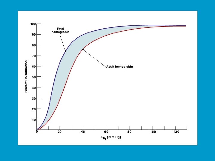 Hemoglobin and Oxygen Transport n n n A shift of the curve to the right because of a decrease in p. H, an increase in carbon dioxide, or an increase in temperature results in a decrease in the ability of hemoglobin to hold oxygen The substance 2. 3 -bisphoglycerate increases the ability of hemoglobin to release oxygen Fetal hemoglobin has a higher affinity for oxygen than does maternal