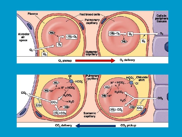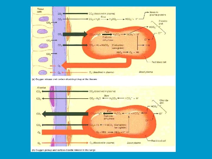 Transport of Carbon Dioxide n n In lung capillaries, bicarbonate ions and hydrogen ions move into RBCs and chloride ions move out. Bicarbonate ions combine with hydrogen ions to form carbonic acid. The carbonic acid is converted to carbon dioxide and water. The carbon dioxide diffuses out of the RBCs. Increased plasma carbon dioxide lowers blood p. H. The respiratory system regulates blood p. H by regulating plasma carbon dioxide levels