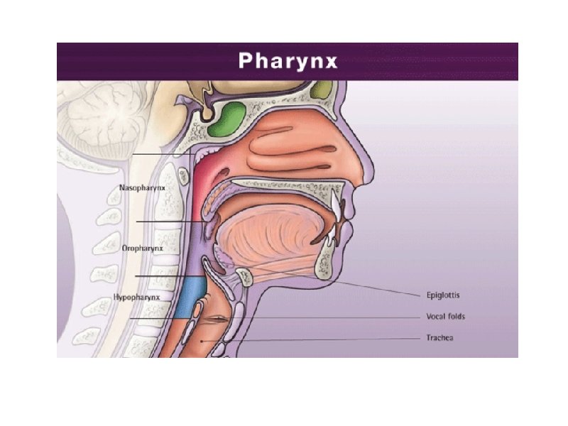 The three pharyngeal regions Pharynx – behind the oral cavity, between the nasal cavity and larynx (space, not a structure)