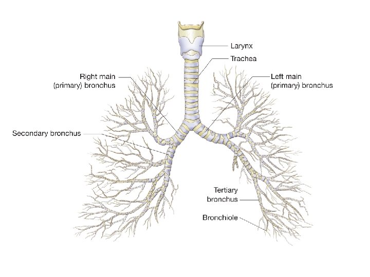 Bronchi • Bifurcates from trachea into lungs - Further subdivides into secondary, (tertiary, etc. bronchi) within the lungs - Bronchioles are 0. 1 mm in diameter - Terminal bronchioles are 0. 05 mm in diameter and lead to the alveoli