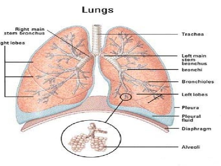 3. Lungs • • Covered by pleural membranes: Parietal, visceral Pleural cavity is filled with serous fluid Each lung is divided into lobes by fissures: Right has 3 lobes, left has 2 Composed of over 300, 000 alveoli