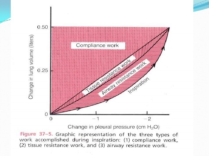 Work of breathing -Work of breathing: 1. work required to expand the lungs against the lung and chest elastic forces (compliance work) 2. work required to overcome the viscosity of the lung and chest wall (tissue resistance work) 3. work required to overcome airway resistance (airway resistance work)