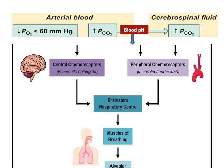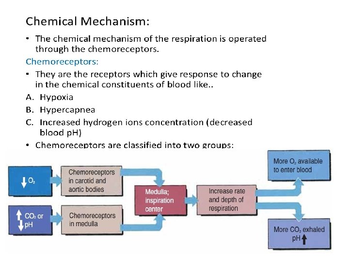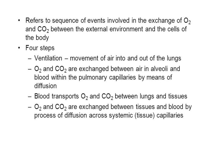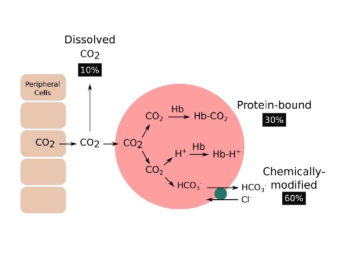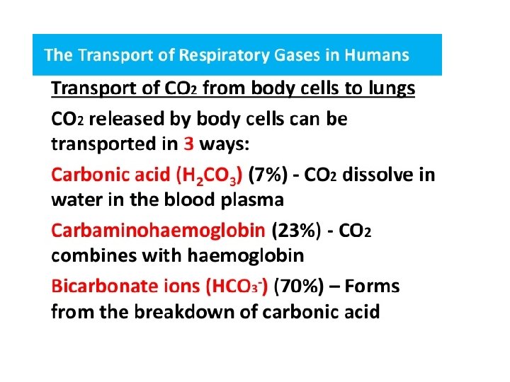 Carbon dioxide transport mechanism • Carbon dioxide produced in the tissue cells diffuses into the blood plasma. • The largest fraction of carbon dioxide diffuses into the red blood cells. The carbon dioxide in the red blood cells is transported as: dissolved CO 2, combined with hemoglobin, or as bicarbonate, (largest fraction). The formation of bicarbonate ions, (HCO 3 - ) takes place by the following reactions: Hydration of CO 2: CO 2 + HOH H 2 CO 3 Dissociation of H 2 CO 3: H 2 CO 3 H+ + HCO 3 • Bicarbonate diffuses out of the red blood cells into the plasma in venous blood and visa versa in arterial blood. • The change in p. H in arterial blood caused by the diffusion of CO 2 out of the blood into the lungs.