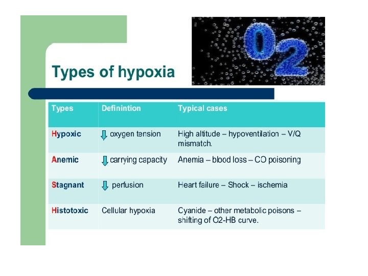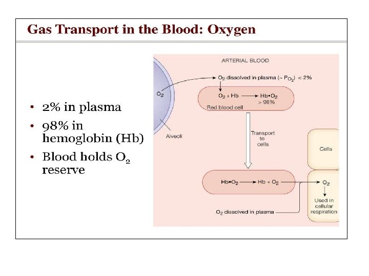 Oxygen transport mechanism • In the lungs, oxygen diffuses from alveolar air into the blood because the venous blood has a lower partial pressure. • The oxygen dissolves in the blood. Only a small amount is carried as a physical solution (0. 31 ml per 100 ml). The remainder of the oxygen is carried in chemical combination with the hemoglobin in red blood cells. • Hemoglobin (molecular weight of 68, 000) is made from 4 hemes, a porphyrin ring containing iron and globin, a 4 protein chains. Oxygen is bound to the iron for the transport process. HHb + O 2 <=======> Hb. O 2 + H+ • Oxyhemoglobin can be caused to release oxygen by the addition of H+ ions at the cells. The difference in p. H (7. 44) of arterial blood and venous blood (p. H = 7. 35) is sufficient to cause release of oxygen from hemoglobin at the tissue cells.