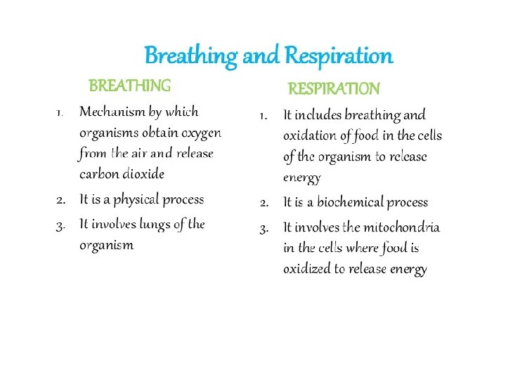 Respiration A physiological process which means the transport of oxygen from atmosphere to the body cell for oxidation of the ingested food materials and elimination of carbon dioxide and other volatile metabolic end products from the cell to the atmosphere. Types: • Rates: 10 -18 per minute