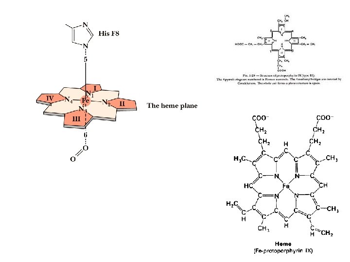 Oxygen can bind to a Heme Prosthetic Group • In multicellular organisms, especially those in which iron, in its O 2 -carrying capacity, must be transported over large distances. • Iron is often incorporated into a protein-bound prosthetic group called heme (haem). • Heme consists of a complex organic ring structure, protoporphyrin, to which is bound a single iron atom (Fe 2+). • The iron atom has 6 coordination bonds, 4 to nitrogen atoms that are part of the flat porphyrin ring sysytem and 2 perpendicular to the porphyrin.