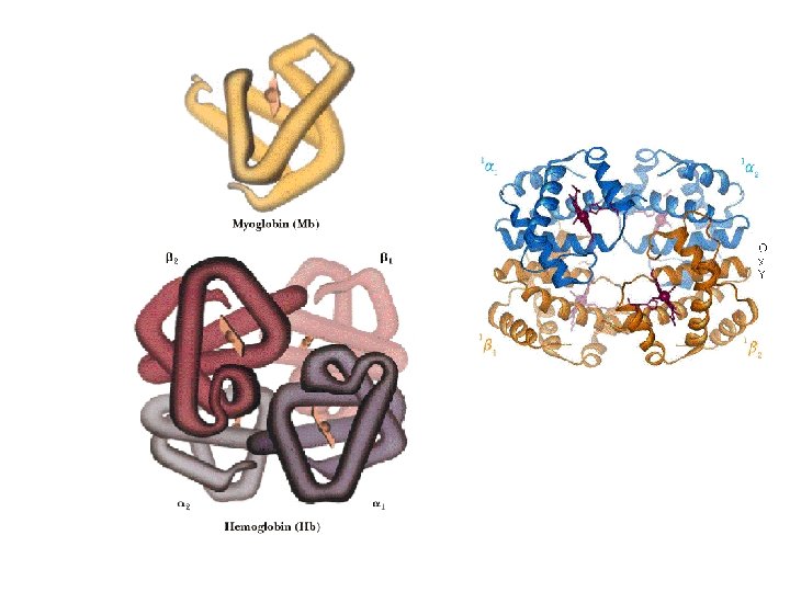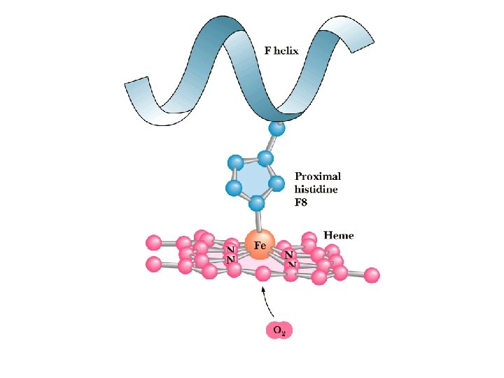 Oxygen can bind to a Heme Prosthetic Group § Iron in the Fe 2+ state binds O 2 reversibly; in the Fe 3+ state it does not bind oxygen. § Free heme mol leave Fe 2+ with 2 “open” coordination bonds. Simultaneous reaction of one O 2 mol with 2 free heme mol can result in irreversible conversion of Fe 2+ to Fe 3+. § This reaction is prevented by sequestering each heme deep within the protein str. Thus access to 2 open coordination bonds is restricted. § One is occupied by a side-chain nitrogen of a His residue. Other is the binding site for O 2.