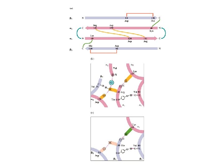 Hb undergoes a Structural Change v. X-ray analysis revealed two major conformations: R state (“relaxed’) & T state (“tense”). v. Oxygen has higher affinity for Hb in the R state. v. When oxygen is absent experimentally, T state is more stable (deoxyhemoglobin). v. Binding of oxygen to a Hb subunit in the T state triggers a change in conformation to the R state. v. T state is stabilized by greater number of ion pairs, many of which lie at the α 1β 2 (and α 2β 1) interface.