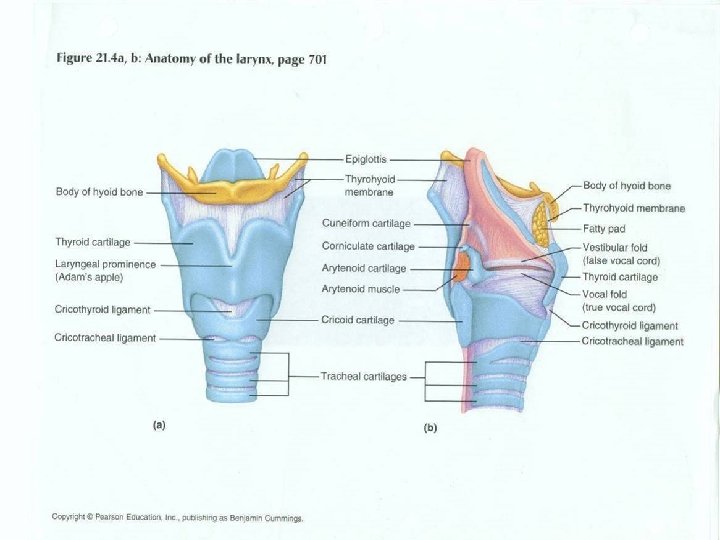 • Ventricular folds 1. superior pair 2. false vocal cords • Vocal folds 1. inferior pair 2. push against ventricular folds to hold breath under pressure