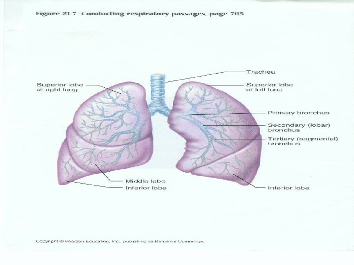 • • Lobes are separated by fissures Right lung has three lobes Left lung has two lobes Branchiopulmonary segment contains small compartment called lobules a. contain lymphatic vessels, arterioles, a venule, and a branch of terminal branchioles b. terminal bronchioles subdivide into respiratory bronchioles