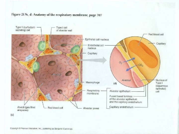 2. Septal cells a. cuboidal epithelial cells b. secretes fluid to keep spaces between cells and air moist • Respiratory membrane layers 1. alveolar walls (epithelial cells) 2. epithelial basement membrane 3. capillary basement membrane 4. enothelial cells of capillary