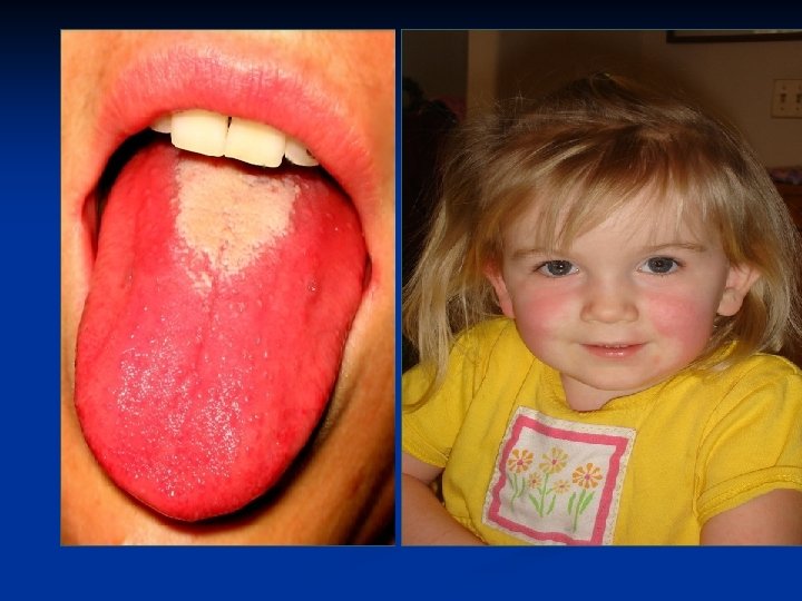 Scarlet fever characteristic tongue ( white strawberry tongue→ red strawberry tongue n haemorrhagic lesions in articular fossae ( Pastia lines) n Desquamation begins after a week from face to limbs n