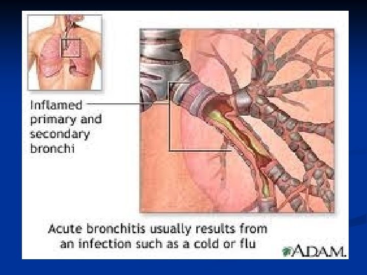 Bronchitis is inflammation of the mucous membranes of the bronchi n Etiology: • Viruses ( Parainfluenzae, Adenovirus, RSvirus, Rhinovirus) • Bacteria (Haemophilus influenzae, Streptococcus pneumoniae, Staphylococcus aureus) • Atopy n