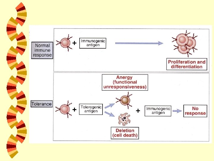 MEKANISME UTAMA TOLERANSI 1. 2. 3. Delesi: kematian sel akibat apoptosis Anergi: inaktivasi fungsi tanpa kematian sel Penekanan aktivasi limfosit dan fungsi efektor oleh limfosit regulator w Toleransi sentral biasanya akibat delesi w Toleransi perifer akibat delesi, anergi dan penekanan aktivasi limfosit/fungsi efektor
