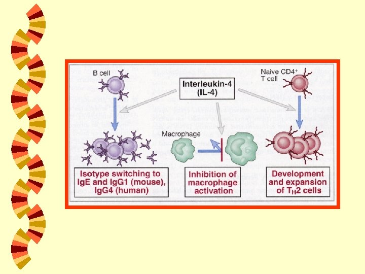 INTERLEUKIN 3 Diproduksi oleh : sel T (Th-1 dan Th-2), NK, mastosit w Fungsi : pertumbuhan diferensiasi semua lineage sel hemopoetik w INTERLEUKIN 4 Diproduksi oleh : sel T (terutama Th-2), B dan mastosit w Penting dalam class switching immunoglobulin menjadi Ig. G 1 dan Ig. E w Fungsi utama : respon imun via Ig. E, sel mastosit/eosinofil w Dikenal juga dengan B-cell stimulating factor w
