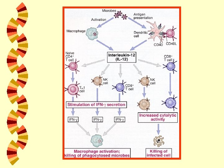 INTERLEUKIN 10 Diproduksi oleh sel monosit dan makrofag yang teraktivasi serta limfosit T w Fungsi : inhibitor dari respon imun (pengontrol respon imun alami dan respon imun seluler) w INTERLEUKIN 12 Diproduksi oleh monosit dan makrofag teraktivasi serta sel dendritik w Sekresi dipicu oleh adanya mikroba w Fungsi : ü Mediator respon imun alami tahap awal ü Menginduksi respon imun seluler pada respon imun dapatan w