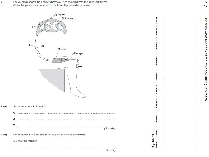 Reflex actions • Automatic responses important for survival • Similar response to a normal conscious action but involves a relay neuron in the spinal cord or unconscious area of the brain • It then travels to the conscious area so you know about the reflex - after it has happened Synapses Junctions between nerves Impulses cross the synapses Chemicals released into the gap between neurons Chemicals attach to the surface of the next neuron and set up a new electrical impulse