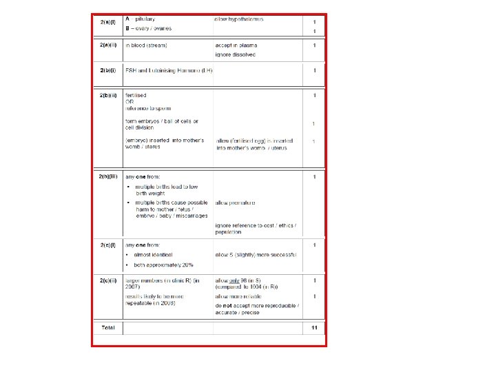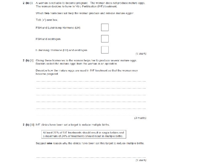 Hormones and fertility • Glands secrete hormones which are then carried around in the blood Menstrual cycle Brought about by hormones made and released by pituitary gland ovaries Hormones: FSH -causes eggs to mature -Stimulates the ovary to produce oestrogen Oestrogen -Causes the lining of the uterus to develop -Inhibits FSH production -Stimulates the release of the mature egg Others: progesterone and LH 28 days: womb lining thickens, Eggs released from ovary after 14 days - ovulation, If not fertilised, the womb lining and egg come out as a period Contraception Inhibits production of FSH so eggs don't mature in the ovaries Fertility treatments FSH used to stimulate eggs to mature and trigger oestrogen production IVF - eggs collected and fertilised in the lab then implanted Advantages - fewer children (cost), women freedom Disadvantages - expensive, multiple births, embryo use
