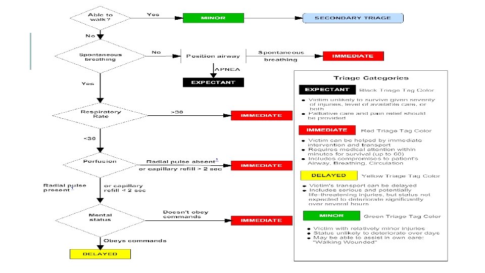 PRIMARY AND SECONDARY TRIAGE ØSecondary triage - ongoing process that takes place after the patient has been moved to a treatment/holding area awaiting transport. ØPrimary triage - 1 st contact-Assign triage category