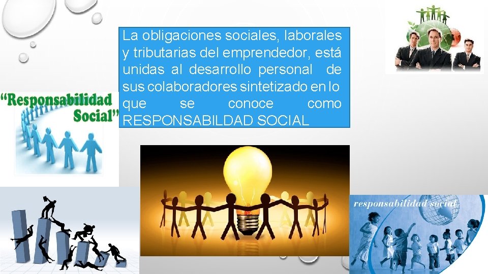 La obligaciones sociales, laborales y tributarias del emprendedor, está unidas al desarrollo personal de sus colaboradores sintetizado en lo que se conoce como RESPONSABILDAD SOCIAL