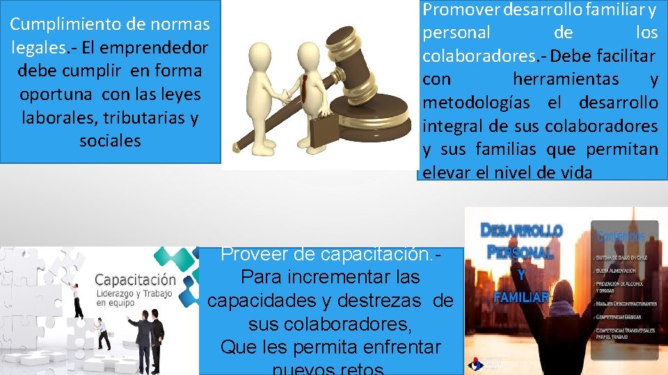 Cumplimiento de normas legales. - El emprendedor debe cumplir en forma oportuna con las leyes laborales, tributarias y sociales Promover desarrollo familiar y personal de los colaboradores. - Debe facilitar con herramientas y metodologías el desarrollo integral de sus colaboradores y sus familias que permitan elevar el nivel de vida Proveer de capacitación. Para incrementar las capacidades y destrezas de sus colaboradores, Que les permita enfrentar