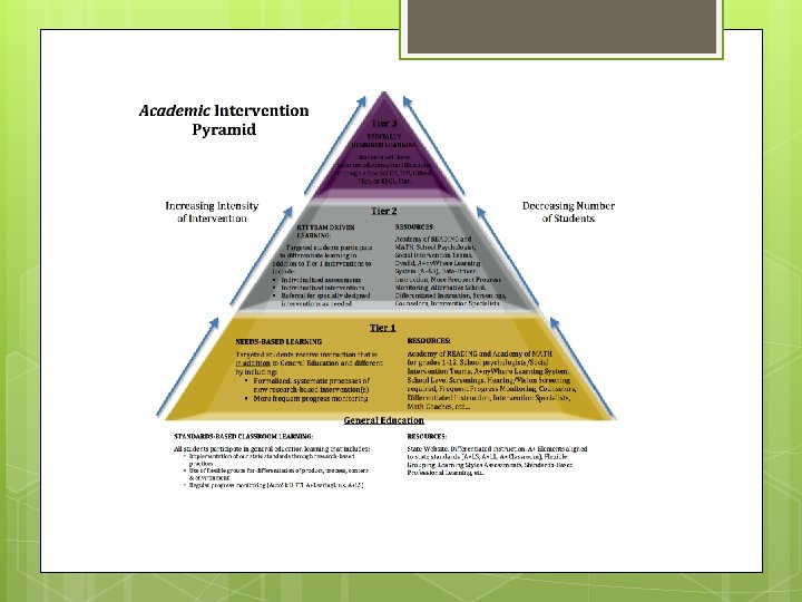 Tiered Instruction Students identified through the universal screening as “at risk” or “struggling” They then move through the general education curriculum with adapted and individualized interventions that increase in intensity (the tiers)for specific students who do not show sufficient learning or skill development. RTI models vary with respect to the number of tiers involved in the process. There is no “official” recommendation as to the most effective number of tiers. Three tiers of instructional intervention is a common practice.