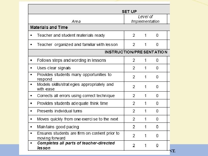 How can schools ensure fidelity of implementation? (NRCLD 2006) • Link interventions to improved outcomes (credibility) • Definitively describe operations, techniques, and components • Clearly define responsibilities of specific persons • Create a data system for measuring operations, techniques, and components • Create a system for feedback and decision making (formative) • Create accountability measures for non-