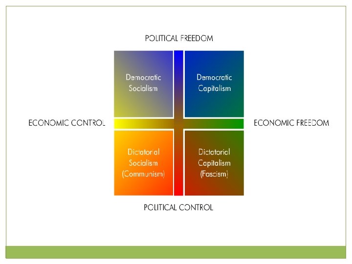 Socialist Ideologies �An ideology based on collectivist values �Specifics Resources should be controlled by the public for the benefit of everyone in society and not by private interests and not for the benefit of the individual Economic equality Security Cooperation Control and direction in the economy �Developed out of a want to reform political, social, and economic structures of 19 th century