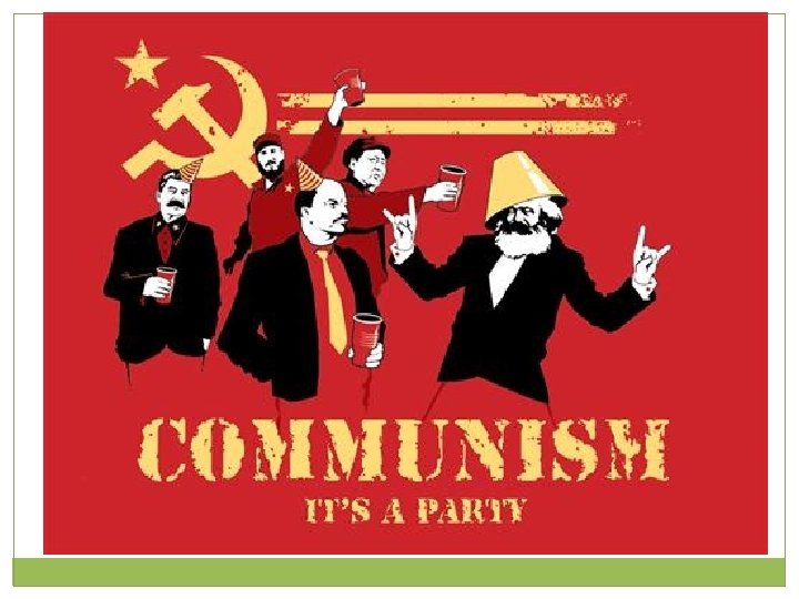 Communism �The abolition of private property and the centralization of the means of production (such as factories and machinery) in the hands of the state would become essential characteristics of the economy of countries that implemented Marxist ideas and communism. �Also known as command economy or planned economy (government planners make decisions and means of production are owned by the state. )