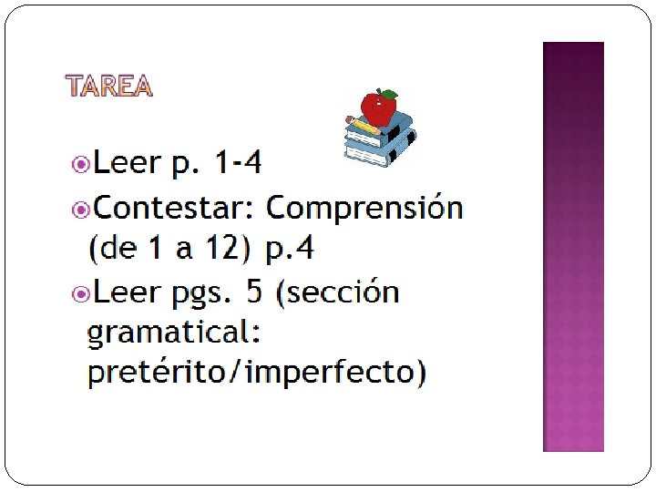 TAREA � 1. Actividad A: Hablando de Juan Pérez � 2. Leer: Recapitulación p. 10 � 3. Leer: Spanish verbs with different English meanings in the imperfect and the preterite � 4. Aplicación: Situaciones y explicaciones