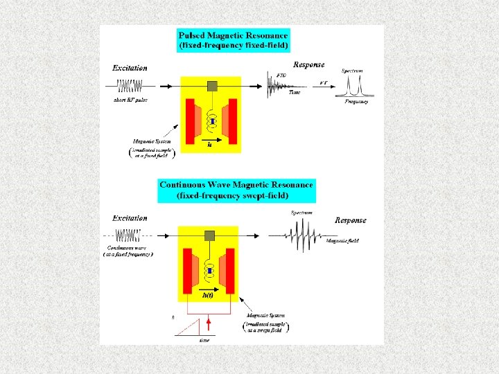 A teoria nos diz que podemos realizar o experimento de RPE ou RMN de duas maneiras diferentes: Excitação com onda contínua (CW) (a maioria dos espectrômetros de RPE do mundo são deste tipo) (“mosca branca” em RMN: obsoleto para a maioria das aplicações) Excitação com onda pulsada (a maioria dos espectrômetros de RMN do mundo são deste tipo) (recém introduzido em RPE: complementar ao CW)