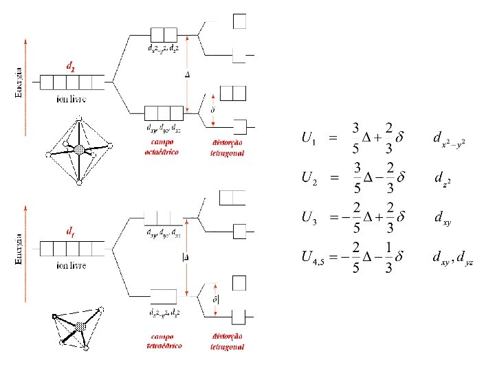 Estado fundamental dos íons dn • Os valores de L e S são os mesmos para dn e dn-10. • Os estados excitados, normalmente, não estão populados. • A degenerescência do estado fundamental é removida pelo campo elétrico dos ligantes.