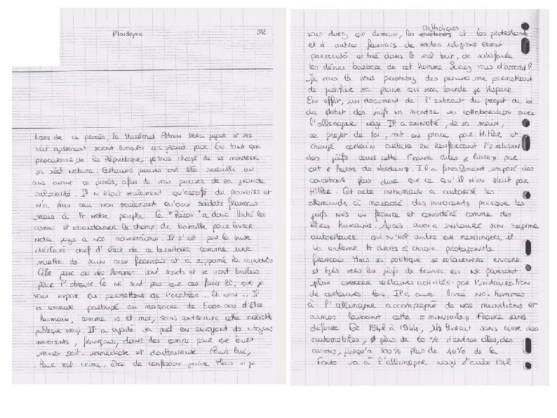Situation d'apprentissage : tâche complexe sur le régime de Vichy Le 23 juillet 1945, à 13 heures, débute le procès du maréchal Pétain à la Haute cour de Justice. Il est jugé pour haute trahison et pour avoir collaboré avec l'Allemagne nazie. L'acte d'accusation est soutenu par le procureur général André Mornet qui requiert la peine de mort. Le premier jour du procès, le maréchal Pétain commence en disant « j'ai passé ma vie au service de la France (…) ma vie m'importe peu, j'ai fait à la France le don de ma personne. » Vous êtes les assistants du procureur général et vous devez démontrer la culpabilité du maréchal Pétain et aider André Mornet à rédiger l'acte d'accusation. Ce dernier vous a remis pour cela divers documents qui montrent les agissements du maréchal durant les quatre années où il a été au pouvoir. Vous disposez de peu de temps alors mettez vous rapidement au travail et bonne chance.