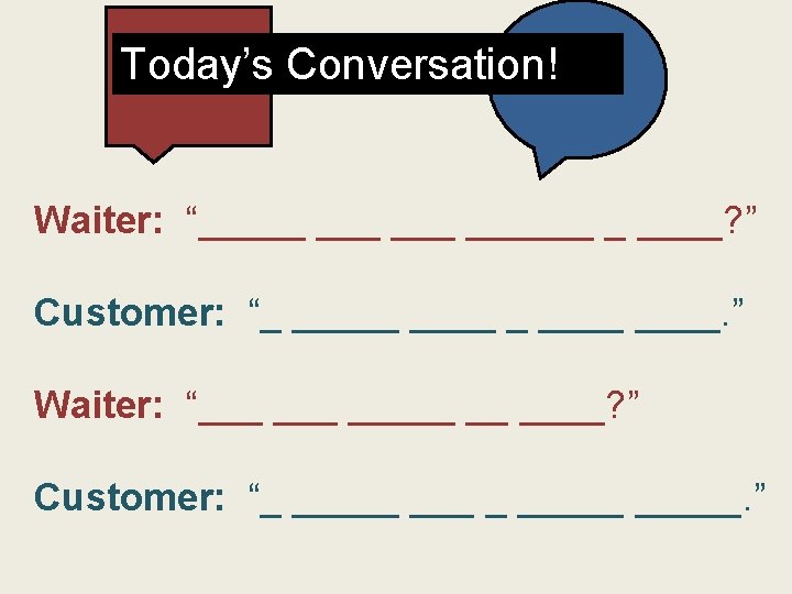 Today’s Conversation! Waiter: “Would you like anything to drink? ” Customer: “I would like a Cola please. ” Waiter: “Are you ready to order? ” Customer: “I would like a cheeseburger please. ”