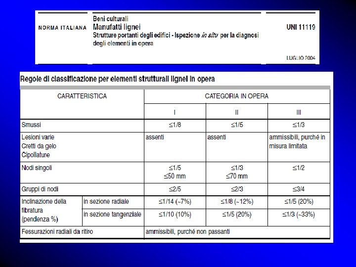 Le regole di classificazione: criteri NODI INCLINAZIONE DELLA FIBRATURA AMPIEZZA ANELLI SMUSSI FESSURAZIONI CIPOLLATURE DEFORMAZIONI DISCOLORAZIONI, CARIE LEGNO DI REAZIONE INSETTI