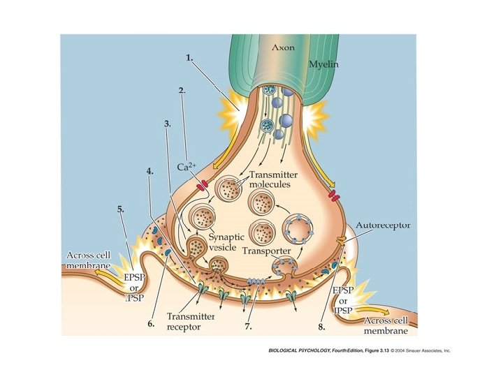 Release and Ca++ • Transmitter is synthesized and stored in vesicles. • Action potential opens voltage-gated Ca++ channels near release sites. • Ca++ activates proteins that move vesicles to release sites. • Exocytosis release and diffusion of transmitter. • EPSPs, IPSPs (depending on ions). • Reuptake or enzyme breakdown of transmitter.