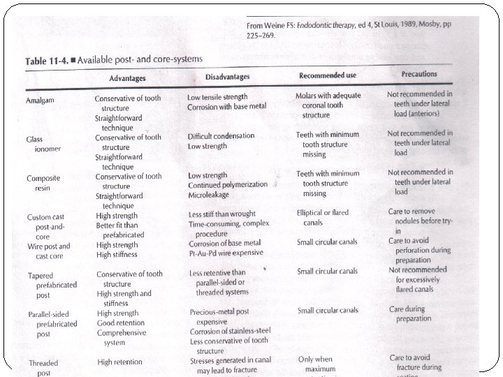 • Different clinical techniques have been proposed to solve these problems, and opinions differ as to the most appropriate one. Recent experimental data have improved our understanding of the difficulties inherent in restoring an endodontically treated tooth