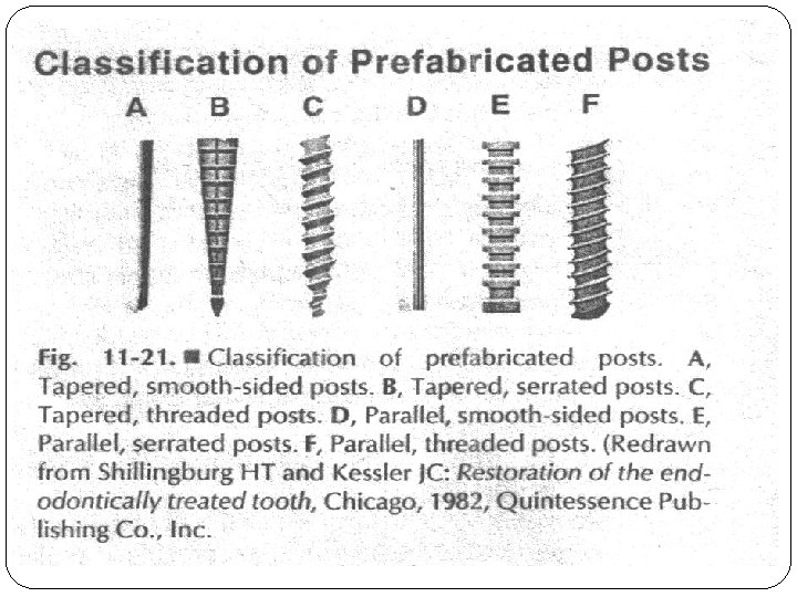 Available materials Prefabricated parallel sided posts are made of Platinum gold palladium (Pt Au Pd or PGP), Nickel chromium (Ni Cr) Ccobalt chromium (Co Cr) stainless steel clasp wire. Serrated posts come in stainless steel, titanium, or nonoxidizing noble alloy. • Tapered posts are available in Au Pt, Ni Cr. and titanium alloys. • All these posts have a high modulus of elasticity and an elongated grain structure, which con tribute to their more suitable physical properties as com pared to cast posts. Essentially, they are more rigid. • • •
