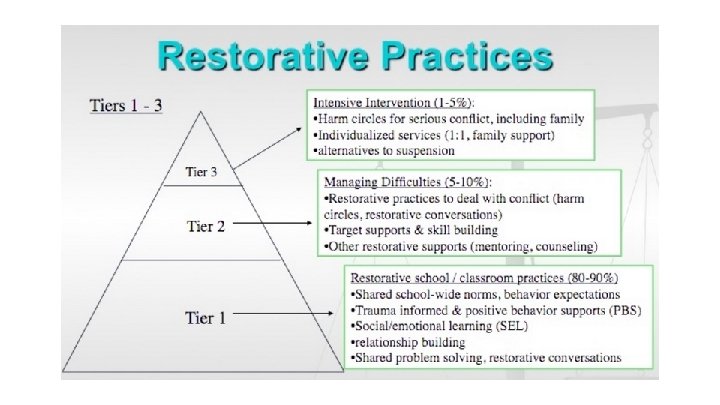 Morning Agenda Whole Schools Time Content Type 9: 00 am MST -9: 45 am MST Welcome, Resonance Practice, Objectives, and Connection Process Interactive 9: 45 -10: 05 Restorative Mindset: How Values and Principles Become Practices (Kris Miner, Presenter) Video (18 m) 10: 05 -10: 10 Q&A/Reflection Interactive 10: 10 -10: 30 Restorative Justice in Education (RJE) Framework: Dr. Martha Brown on Creating Restorative Schools & Humanizing Education (18 m video) Video (18 m) 10: 30 -10: 35 Q&A Interactive 10: 35 -11: 30 am Tiers: 1, 2, and 3 Presentation & Video of Tier One Circle (10 m) Tier Two: “The Zone” (3: 45) 11: 30 -12: 30 pm LUNCH