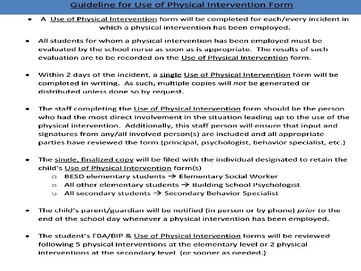 Use of Restraints: Requirements • Limited Purpose - restraint cannot be used as: 1. Punishment 2. A substitute for systematic behavioral interventions that are designed to change, replace, modify or eliminate a targeted behavior (i. e. a Behavior Intervention Plan)