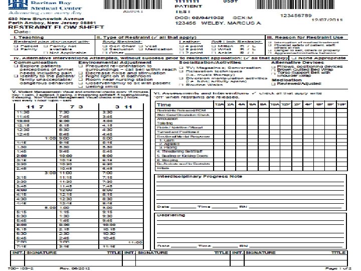 ASSESSMENT &MONITORING – RESPONSIBILITY OF THE RN Revaluation of the need for restraints at least every 2 hrs. Toileting at least every 2 hrs Release of restraints at least every 2 hrs: circulation checks, skin assessment and care, ROM for a minimum of 5 minutes per limb. Meals and fluids at least 3 x a day, more often if necessary Assistance with bathing at least once per day Ambulation at least once every 4 hrs, if clinically feasible Documentation – Restraint Flow Sheet Should match the rationale for continued use, e. g. patients noted to be awake, oriented and cooperative should not still be restrained. Modify Interdisciplinary Plan of Care to reflect use of restraints/seclusion Update Kardex