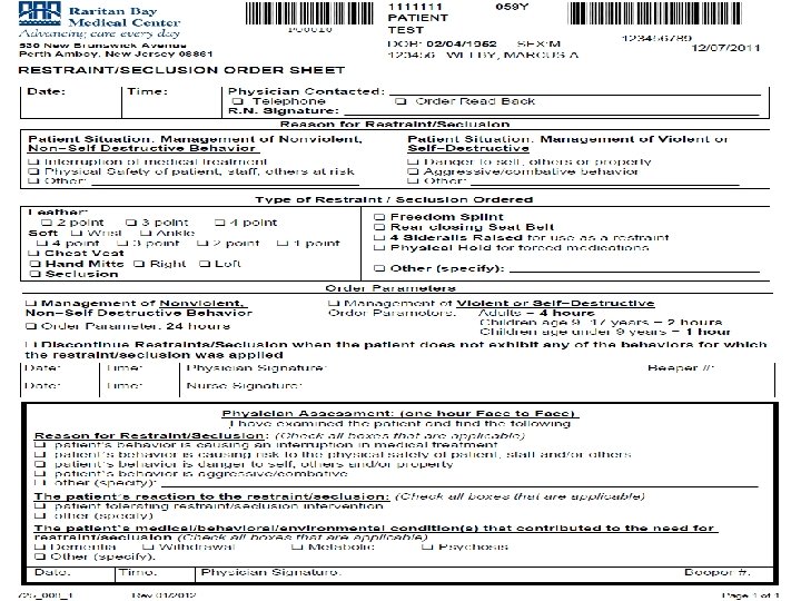 CLASSIFICATION OF RESTRAINTS Non-Violent or Non Self-Destructive Order parameter: Daily Face to face evaluation by LIP *(1 hour time frame does not apply) Visual observation and documentation at least q 2 hrs If on chest posey/vest, visual observation during sleep time 10 pm-6 am is at least q 1 hr LIP: Licensed Independent Practitioner *Forthcoming changes in the policy Violent or Self-Destructive Behavior Order parameters: Adults: 4 hours Children 9 -17 yrs old: 2 hours Children < 9 yrs old: 1 hour Face to face evaluation by LIP w/in 1 hour of initiation of restraint Continuous monitoring Documentation at least q 15 min
