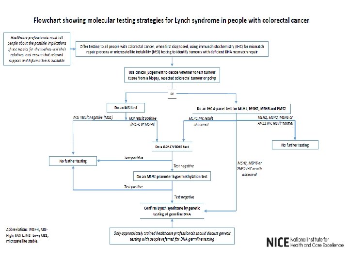 Further investigations • Referred to clinical genetics for investigation of possible underlying Lynch Syndrome • FH: – sister hysterectomy for cancer – maternal: mother diagnosed with bowel cancer aged 67 – paternal: uncles and grandmother cancer ? type, grandfather melanoma, cousin stomach cancer – son melanoma aged 42, daughter breast cancer • Germline mutation analysis negative