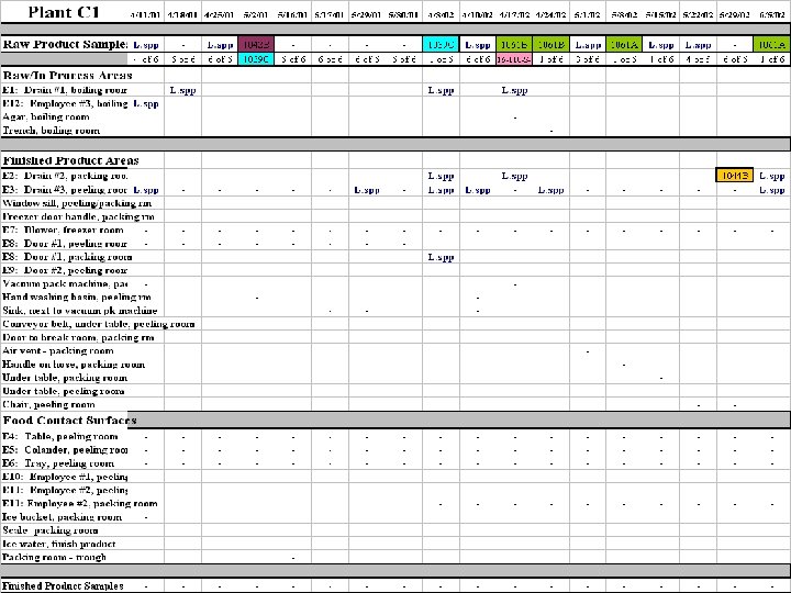 Microbiology data & results n n Different numbers & colors mean different Lm (pathogens) ribotypes L. ssp means Listeria (non-pathogens) other than monocytogenes Raw & Finished product had six lots tested at each sampling week “-” means no Listeria were found
