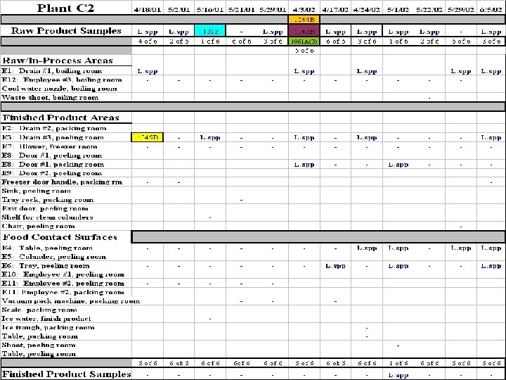 Sampling Sites n Divided into 5 groups n n n Raw Product samples Raw/In-Process areas Cooked/In-Process areas Food Contact Surfaces Finished Product samples
