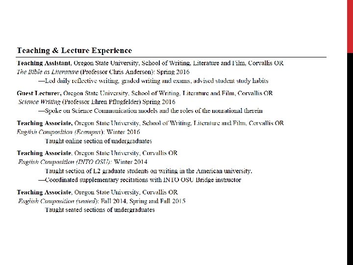 THE PARTS OF A RESUME Credentials • Education • Most recent education first • Then (in reverse chronological order) everything significant since high school. This includes military training, other training programs, internships or workshops! • If there are certain courses that highlight the credentials that the job asks for, specify and quantify. • “Completed 28 hours in major courses in business marketing, management, and materials in addition to 12 hours in information science, including web design and publishing” • Mention projects, experiments, or reports that bear directly on the job you are seeking • List your GPA only if it is 3. 0 or above.